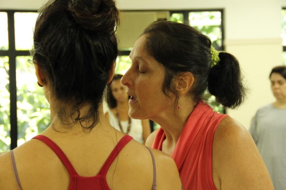 Na busca de se perceber a partir da relação com o outro, trabalhamos também com toque, um tocando o rosto do outro, experimentando seus contornos. Fizemos vários jogos para aguçar a percepção, para proporcionar uma experiência através da sensibilidade: em dupla, enquanto um tinha os olhos fechados e o outro cantarolava uma música no seu ouvido, como um sussurro, depois a gente pediu à pessoa que cantava para se deslocar na sala, e quem estava de olho fechado tinha que caminhar na busca daquele som. Destaco aqui o momento em que uma professora, ao encontrar a colega que cantava, abraçou-a e falou: “Eu senti que tinha perdido a minha conexão com o mundo!”, outra disse: “Senti que estava ouvindo a minha mãe cantar”, outra: “Ah, ainda bem, te achei!”. Quase todos se abraçaram. A cumplicidade e o vínculo, fundamentais num processo de formação, se criam imediatamente quando trabalhamos a partir de uma experiência mais sensível.