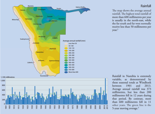 Le pays connaît une très faible densité de population sur un vaste territoire soumis à un climat aride et au fort risque de sécheresse, la dernière en 2013, a été la plus longue sécheresse depuis 30 ans. La production agricole (hors pêche) est centrée essentiellement sur l’élevage extensif. La production céréalière et horticole, tributaire des conditions climatiques, reste en dessous de la demande et nécessite des importations. Si l’agriculture n’est pas un secteur très lucratif, il représente pour autant la première source d’emplois avec notamment 36 000 ouvriers agricoles travaillant pour les fermiers propriétaires et permet de faire vivre 60 % de la population namibienne.