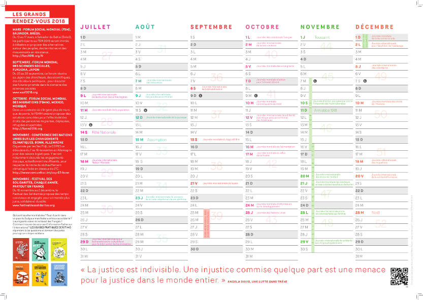 Accompagnant l’agenda de la solidarité internationale, ce calendrier en couleurs rappelle les journées mondiales à ne pas oublier : journée des droits de l’homme, journée des droits des femmes, journée de l’environnement, journée des réfugiés…