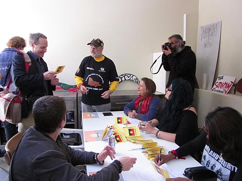 Pour Uncle Ray Jackson, voici l’objectif de la cérémonie de remise de passeport aborigène : « La délivrance des passeports fait interagir de deux manières les Propriétaires traditionnels des Terres et les migrant·es, les demandeur·ses d’asile et les autres citoyen·nes non-aborigènes de ce pays. Ils et elles reconnaissent nos droits sur tous les territoires des Nations aborigènes d’Australie, et en échange nous leur souhaitons la bienvenue sur les terres de nos Nations » [2]. Au cours de la cérémonie, les Australien·nes non-aborigènes doivent acheter un passeport aborigène et prêter officiellement serment en reconnaissant la souveraineté autochtone non-cédée sur les terres des différentes Nations autochtones à travers le continent australien (photo 1) : un acte anticolonial fondamental de rejet de l’autorité illégitime de l’État colonial.