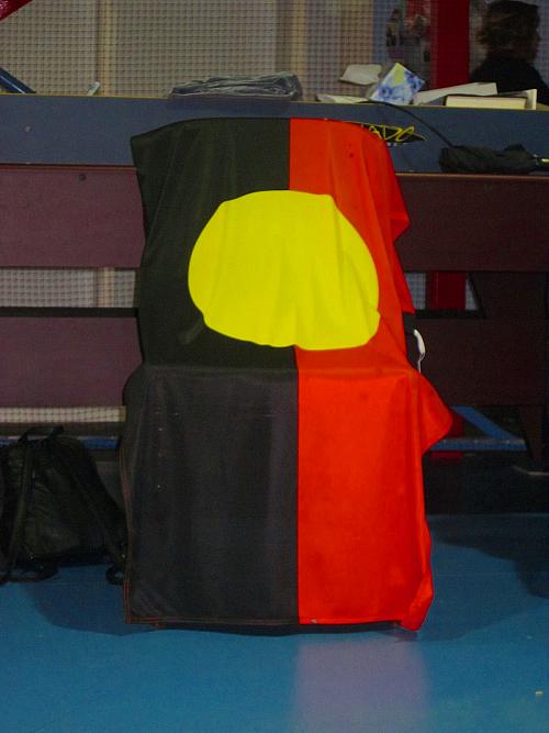 À l’occasion de la première cérémonie de remise de passeport aborigène, Uncle Ray Jackson a non seulement délivré des passeports à un certain nombre de demandeur·ses d’asile et de réfugié·es, mais aussi rendu un vibrant hommage à ceux et celles qui ne pouvaient assister à la cérémonie car elles·ils étaient enfermé·es dans les prisons australiennes pour migrant·es, ou car ils·elles avaient péri dans ces prisons. Il a ainsi installé, au centre de la pièce, une chaise vide recouverte du drapeau aborigène (photo 2).