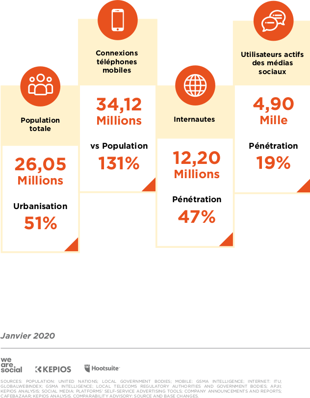 « Selon des informations de l’ Internetworldstats.com (IWS) / AfricaScope, en 2016, la population utilise Internet à travers les réseaux sociaux pour échanger entre amis, prendre les nouvelles de la famille via Whatsapp ou Messenger (55%). Egalement pour rechercher des informations professionnelles (41%) ou encore télécharger des fichiers audio ou vidéo (40%) et enfin pour consulter des sites d’actualités (40%) ».