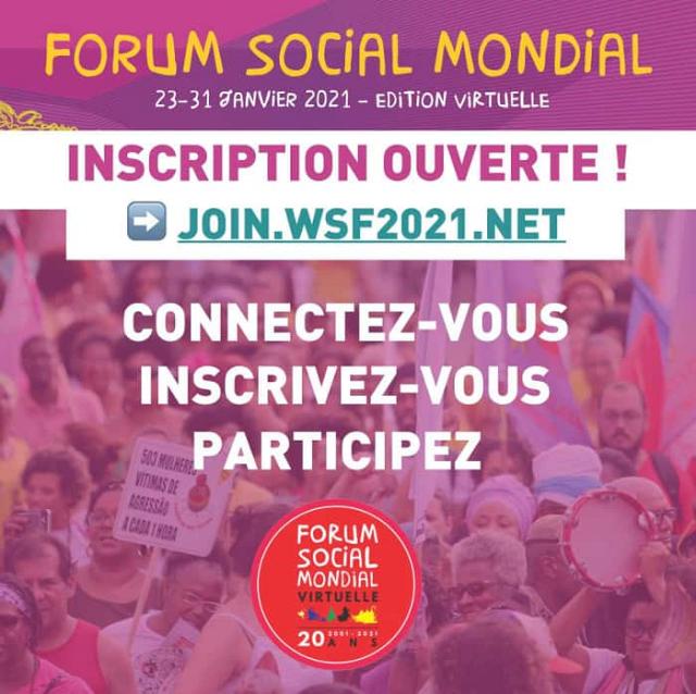 Du 23 au 31 janvier 2021 aura lieu la première édition virtuelle du Forum social mondial. Les organisations et mouvements du monde entier sont invités à y participer, pour échanger sur les réponses à apporter à la crise sanitaire, économique et sociale actuelle, pour construire les alternatives au système néolibéral, inégalitaire, liberticide et autoritaire.