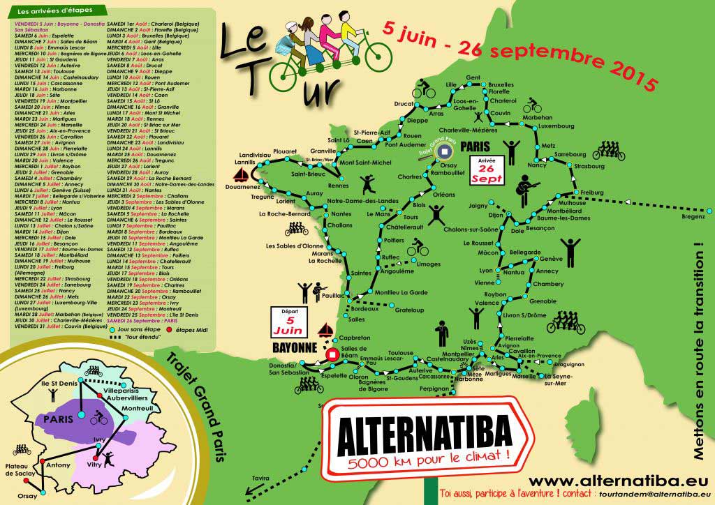 Le Tour Alternatiba va parcourir plus de 5000 kilomètres pendant l’été 2015 avec des vélos tandem 3 et 4 places, pour mobiliser des dizaines de milliers de personnes autour des « vraies alternatives » au changement climatique.