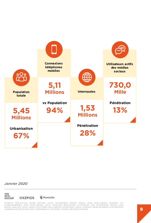 Dans son rapport sur l’Internet mobile du mois d’octobre 2020, l’ARPCE donne les chiffres de l’internet pour le pays. Le taux de pénétration arrive à 50 %, avec 2 850 000 abonné-es à l’Internet mobile. Deux fournisseurs sont mentionnés comme « opérateurs dominants » : MTN (63,2 % des abonné-es) et Airtel (36,8%). Selon ces données, le trafic internet passe essentiellement par le réseau 4G (10 092 077 mégaoctets sur les 10 mois étudiés en 2020), suivi par la 3G (9 392 372 mégaoctets entre janvier et octobre 2020), puis par le réseau GPRS/EDGE/2G (444 260 mégaoctets).
