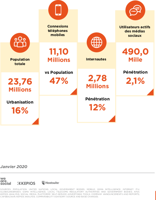 L’opérateur principal est Airtel (presque 50%) ; suivi de Moov puis Orange et Niger Telecoms. Enfin, l’agence note qu’il y a désormais 5 934 182 abonnés à internet. Les fournisseurs étant les mêmes que les opérateurs mobile. En octobre 2018, les frais d’itinérance entre pays du G5 Sahel sont supprimés (« les frais d’itinérance sont encourus lorsque les usagers utilisent leur téléphone mobile en dehors de la zone de couverture de leur fournisseur »).