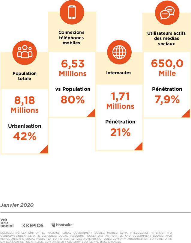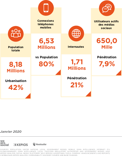Dans son rapport du 4e trimestre 2019, l’ARCEP note qu’il y a désormais 43608 abonnements à la téléphonie fixe, 6 239 183 abonnements à la téléphonie mobile (taux de pénétration : 81,91%) et 4 671 179 abonnements « à la data mobile » (taux de pénétration internet mobile : 61,32%, mais taux de pénétration internet haut débit mobile : 43,61 %). Le nombre d’abonnements à l’internet fixe est de 31 889 (taux de pénétration : 0,42%).
