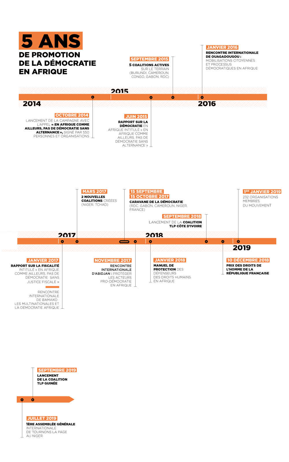 Tournons La Page a d’abord vu le jour sous la forme d’une campagne internationale lancée le 15 octobre 2014 par un appel intitulé « En Afrique comme ailleurs, pas de démocratie sans alternance » signé par 550 organisations et personnalités d’Afrique et d’Europe :